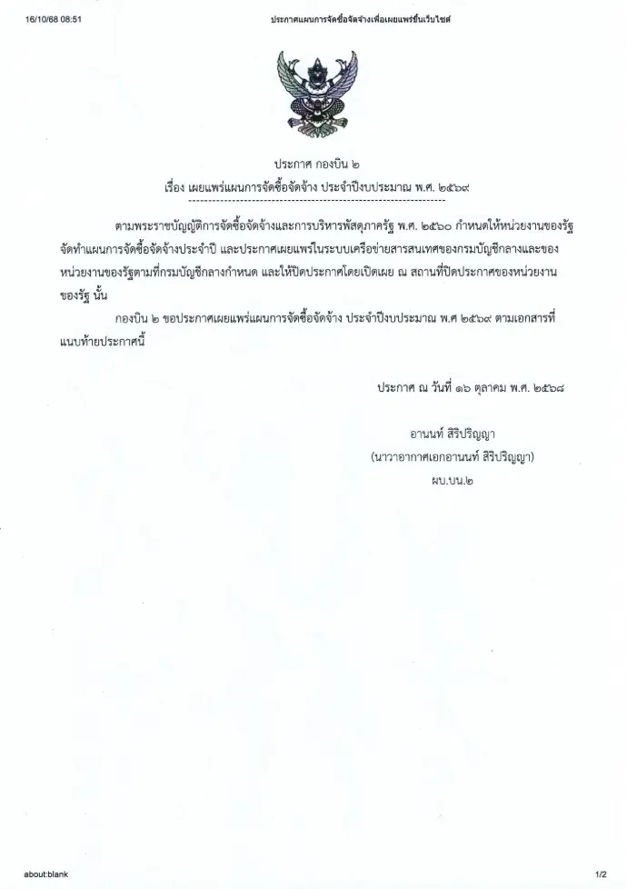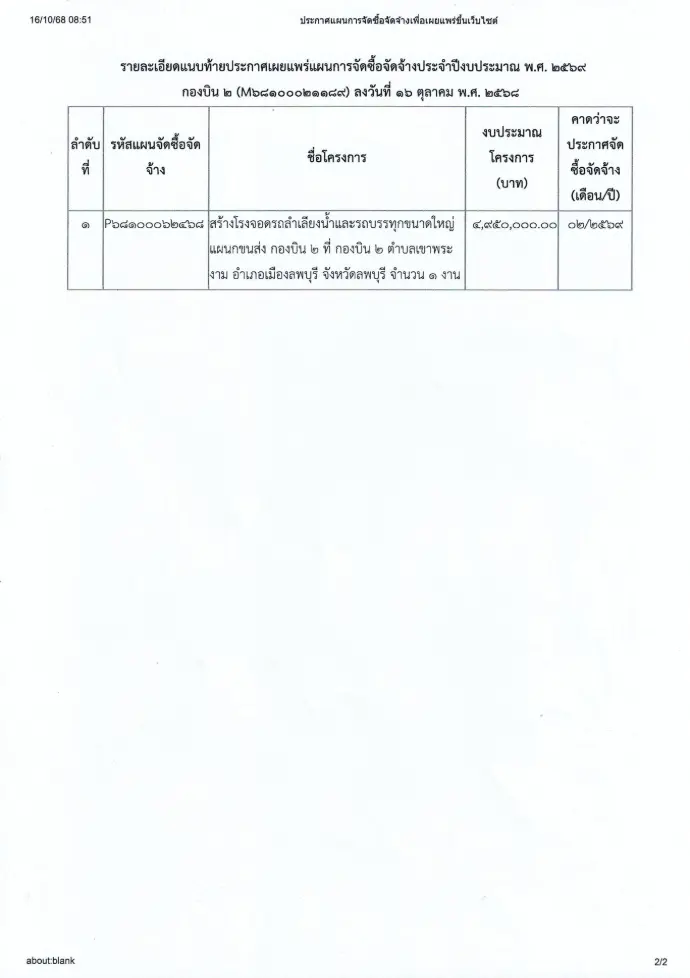 ประกาศเผยแพร่แผนการจัดซื้อจัดจ้างประจำปี พ.ศ.2569 งานสร้างโรงจอดรถลำเลียงน้ำและรถบรรทุกขนาดใหญ่ แผนกขนส่ง กองบิน 2 ที่ กองบิน 2 ตำบลเขาพระงาม อำเภอเมืองลพบุรี จังหวัดลพบุรี จำนวน 1 งาน ณ วันที่ 16 ตุลาคม 2568