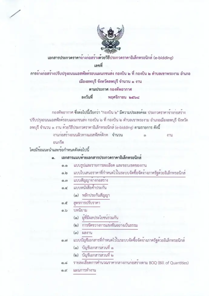 ประกาศกองบิน 2 เรื่อง งานจ้างปรับปรุงถนนแอสฟัลต์รอบแผนกขนส่ง กองบิน 2 ที่ กองบิน 2 ตำบลเขาพระงาม อำเภอเมืองลพบุรี จังหวัดลพบุรี จำนวน 1 งาน ด้วยวิธีประกวดราคาอิเล็กทรอนิกส์ (e-bidding) ประกาศ ณ วันที่ 5 พฤศจิกายน 2568