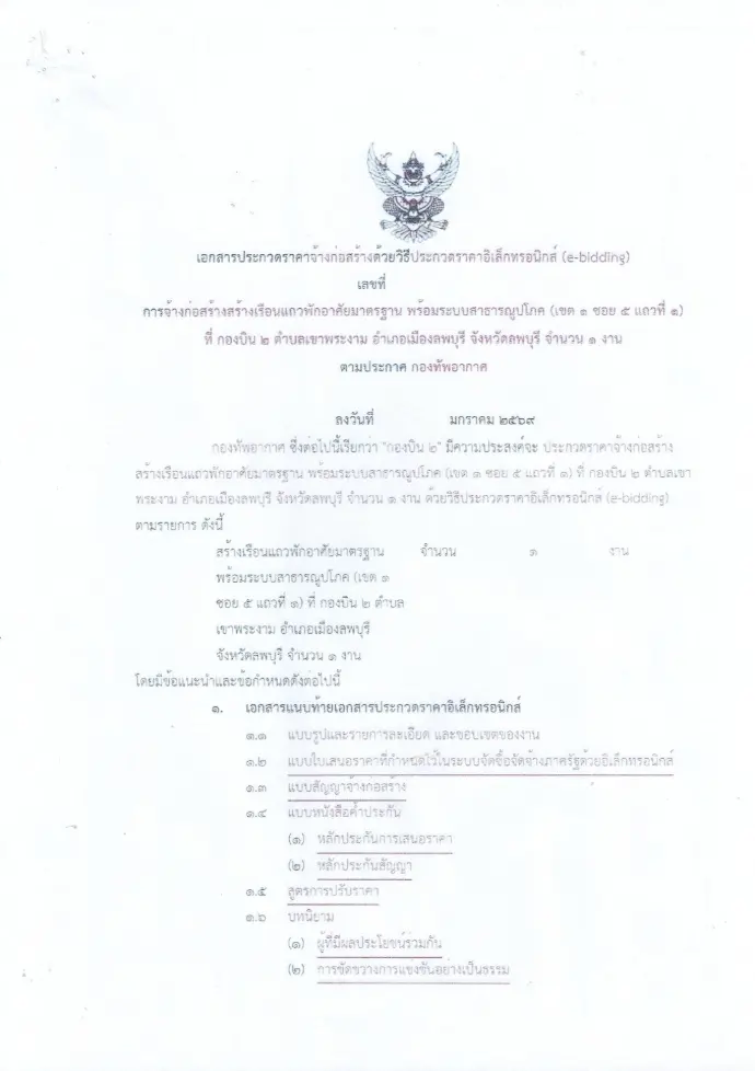 ประกาศกองบิน 2 เรื่อง ประกาศร่างเอกสาร งานจ้างก่อสร้างเรือนแถวพักอาศัยมาตรฐาน พร้อมระบบสาธารณูปโภค (เขต 1 ซอย 5 แถวที่ 1) ที่ กองบิน 2 ตำบลเขาพระงาม อำเภอเมืองลพบุรี จังหวัดลพบุรี จำนวน 1 งาน ด้วยวิธีประกวดราคาอิเล็กทรอนิกส์ (e-bidding) ประกาศ ณ วันที่ 12 มกราคม 2569
