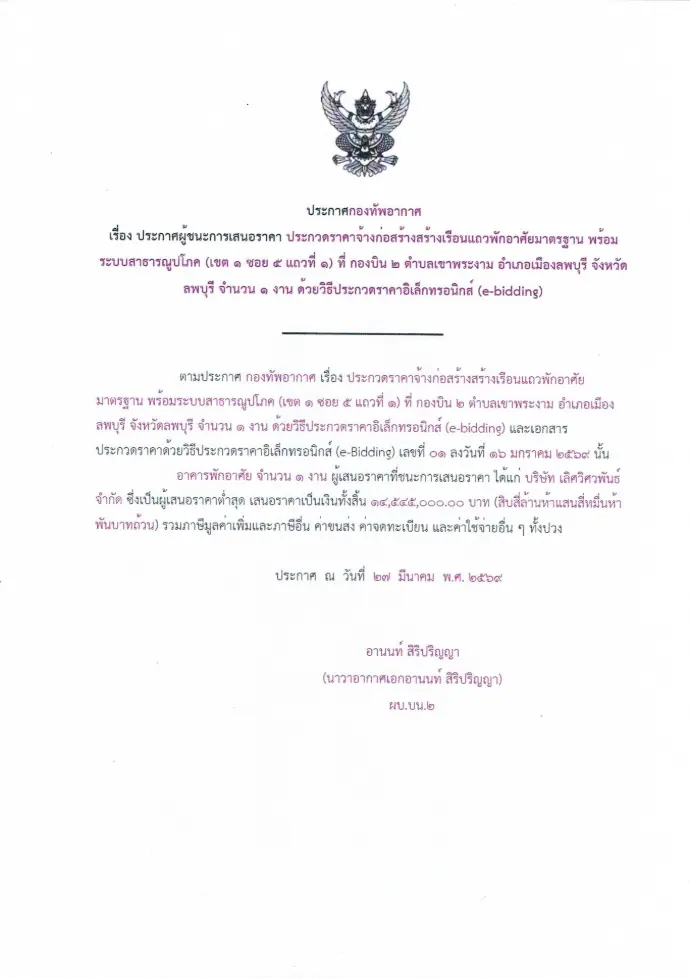 ประกาศผู้ชนะการเสนอราคางานจ้างสร้างเรือนแถวพักอาศัยมาตรฐาน พร้อมระบบสาธารณูปโภค (เขต 1 ซอย 5 แถวที่ 1) ที่ กองบิน 2 ตำบลเขาพระงาม อำเภอเมืองลพบุรี จังหวัดลพบุรี จำนวน 1 งาน ด้วยวิธีประกวดราคาอิเล็กทรอนิกส์ (e-bidding) ประกาศ ณ วันที่ 27 มีนาคม 2569