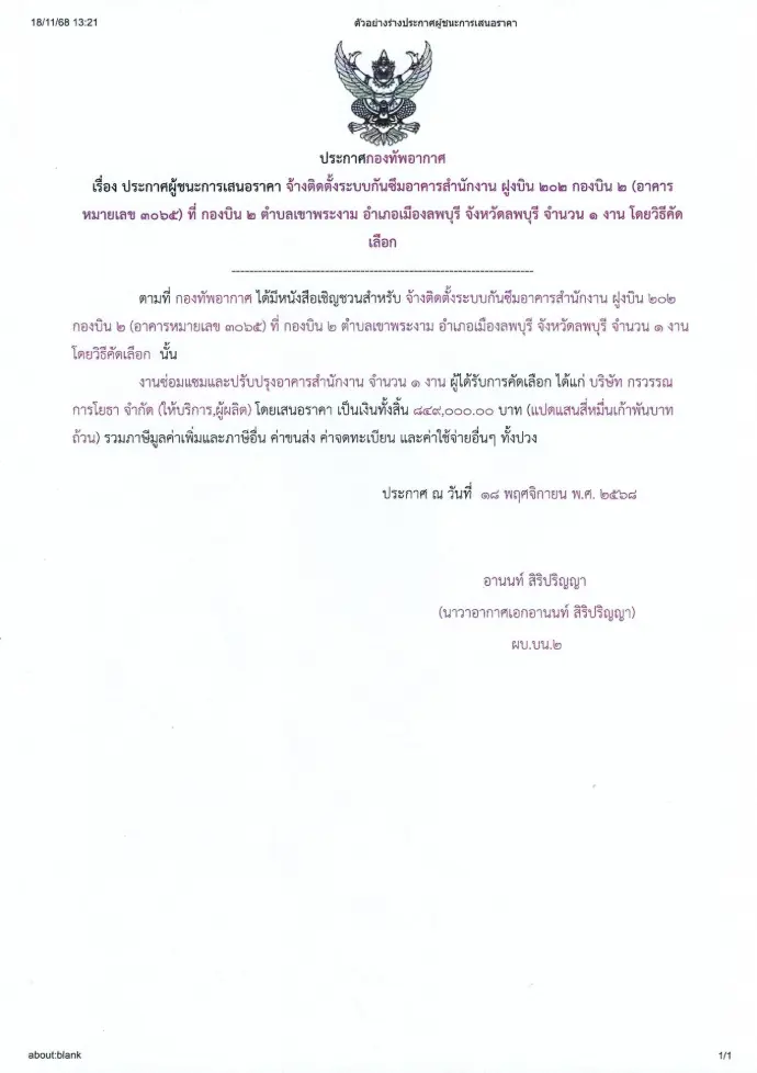 ประกาศผู้ชนะการเสนอราคางานจ้างติดตั้งระบบกันซึมอาคารสำนักงาน ฝูงบิน 202 กองบิน 2 (อาคารหมายเลข 3065) ที่ กองบิน 2 ตำบลเขาพระงาม อำเภอเมืองลพบุรี จังหวัดลพบุรี จำนวน 1 งาน โดยวิธีคัดเลือก ประกาศ ณ วันที่ 18 พฤศจิกายน 2568