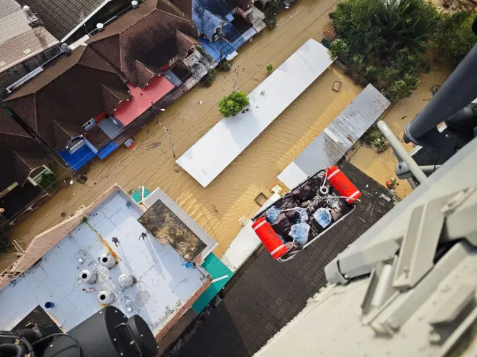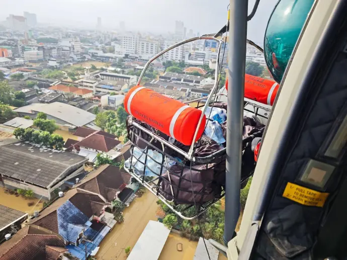 ขณะที่ เฮลิคอปเตอร์ H-135 ซึ่งมีความคล่องตัวสูง ทำหน้าที่ลำเลียงถุงยังชีพไปยังพื้นที่ที่ถูกน้ำท่วมตัดขาดและเข้าถึงได้ยาก